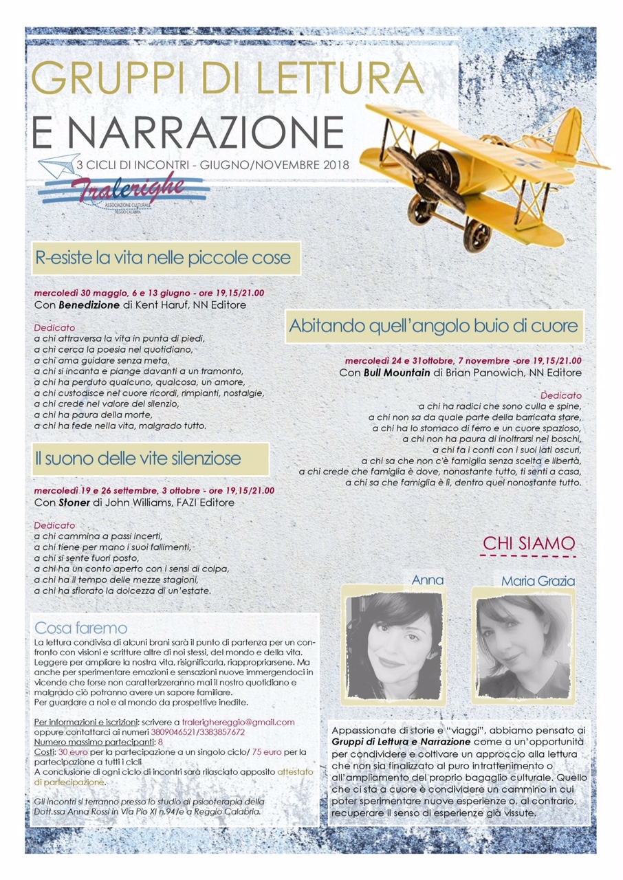 Al via il 30 maggio i Gruppi di Lettura e Narrazione. Tre cicli di incontri in programma sino a novembre. Tre preziosi testi a partire dai quali, attraverso una lettura condivisa di alcuni brani, i partecipanti avranno modo di vivere nuove esperienze o, al contrario, di recuperare il senso di esperienze già vissute.