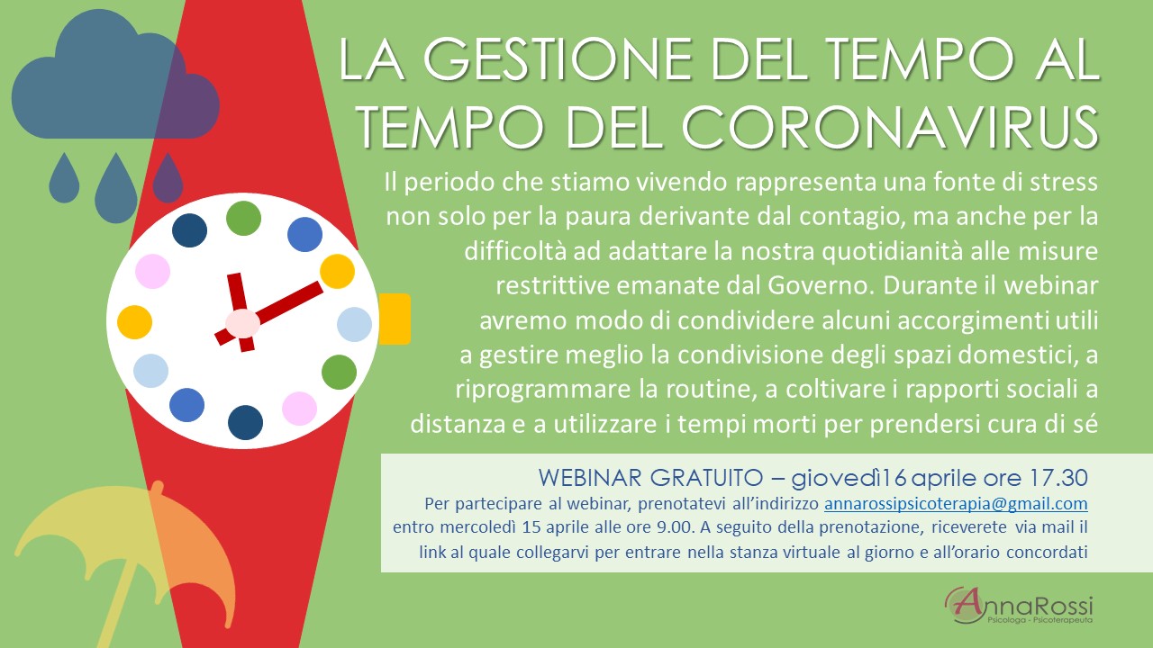 In questo periodo, a fronte delle misure restrittive emanate dal governo, possiamo vivere con difficoltà lo scorrere della nostra quotidianità. Durante il webinar avremo modo di condividere alcuni utili accorgimenti per riappropriarci del nostro tempo in tempo di quarantena.